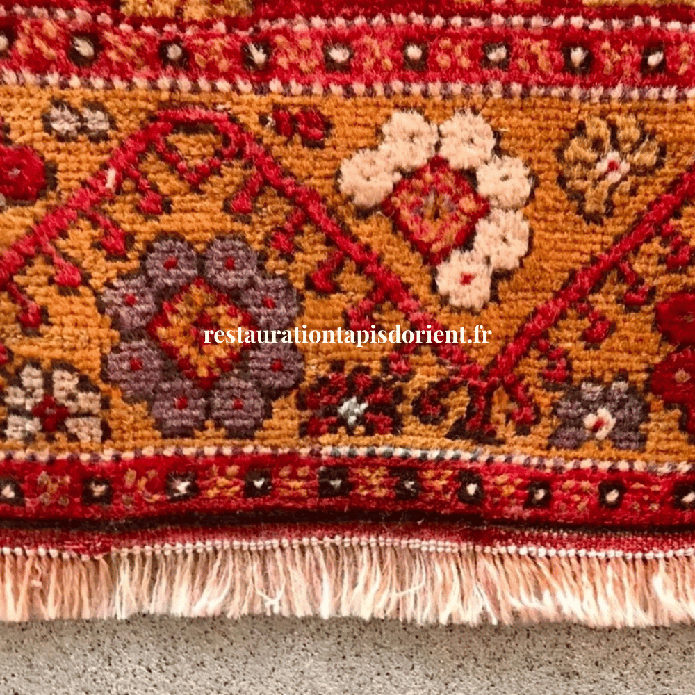 Nous avons restauré de nombreux tapis en Bretagne, du modèle ancien abîmé au tapis en soie brûlé ou infesté. Les résultats sont visibles sur chaque détail : franges remises à neuf, trous comblés, couleurs ravivées.